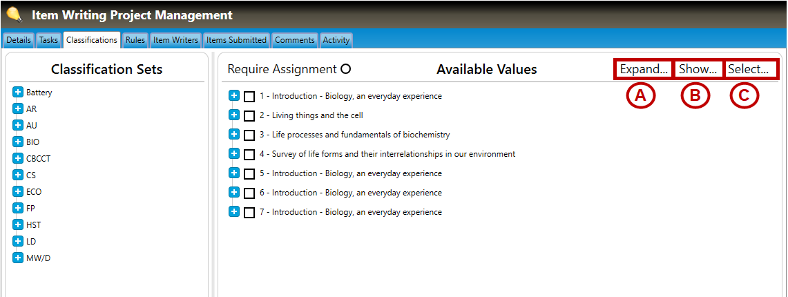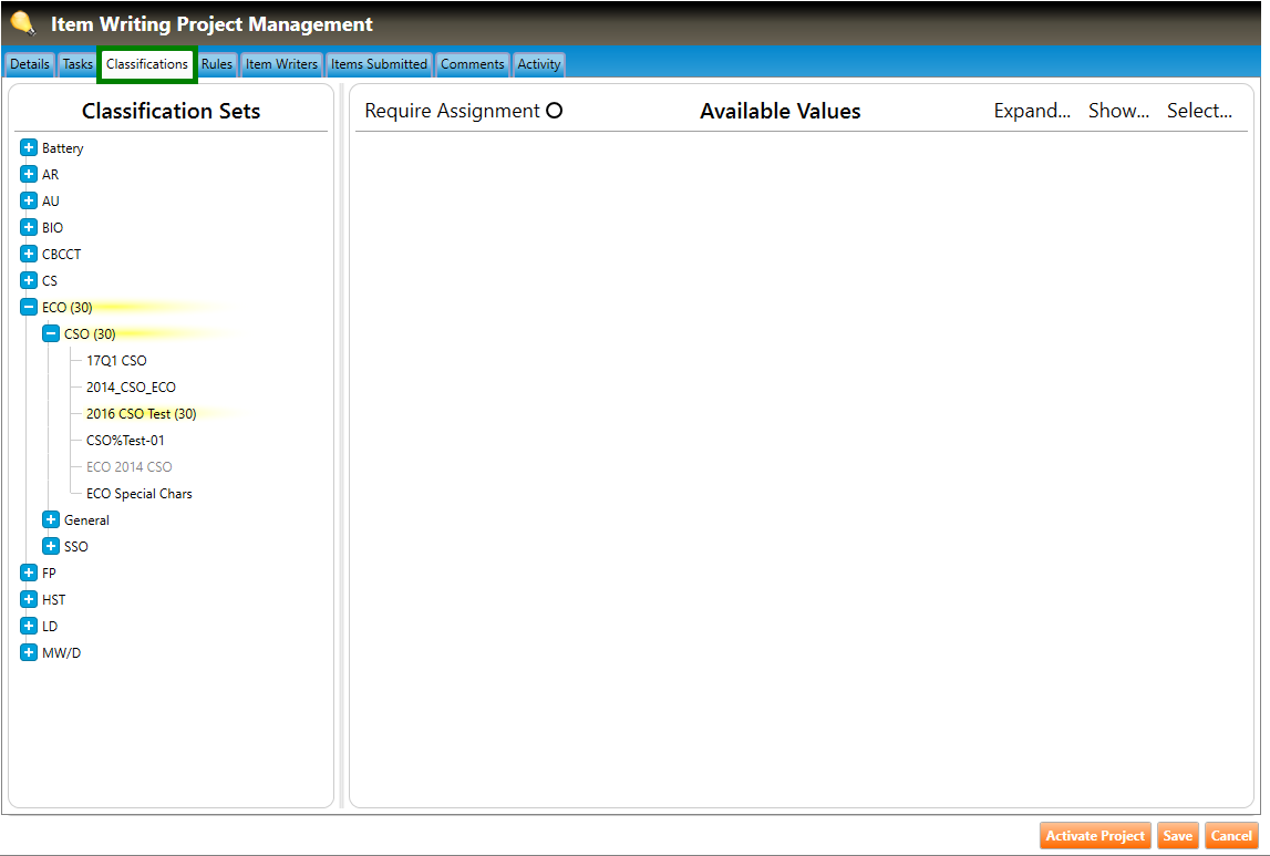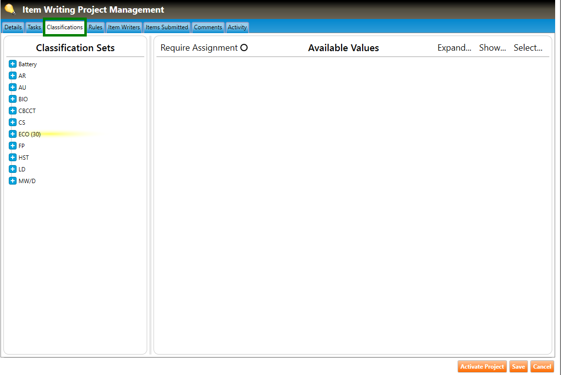 1. Navigate to the Classifications tab of the Item Writing Project Management screen (highlighted in green below). Any section with classification sets selected for the project will appear in the Classification Sets pane highlighted in yellow with a selected value count displayed.