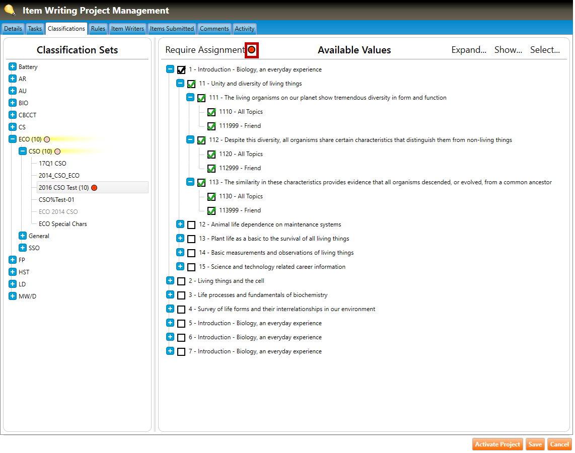 5. Setting new or existing classification set to be identified as required by clicking the Require Assignment icon (highlighted in red, below). This will require item writers to assign a selected value for this classification set when authoring an item.