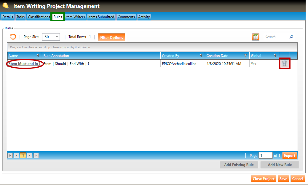 2. To delete a rule that has already been added to a project, click the trash can icon of the desired rule (highlighted in red square, above) and follow any confirmation prompts to delete the rule.