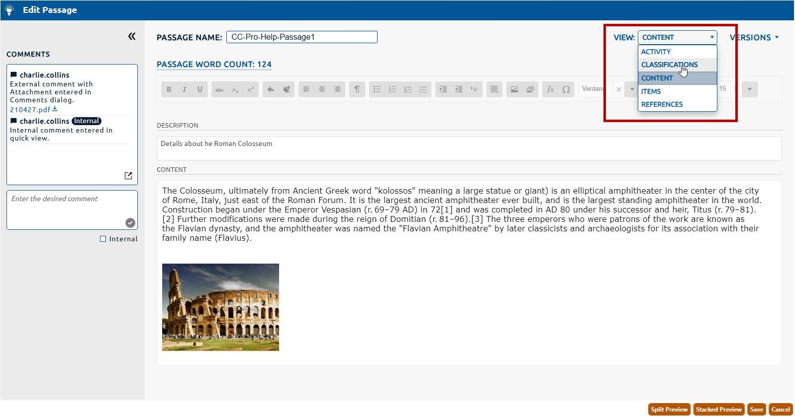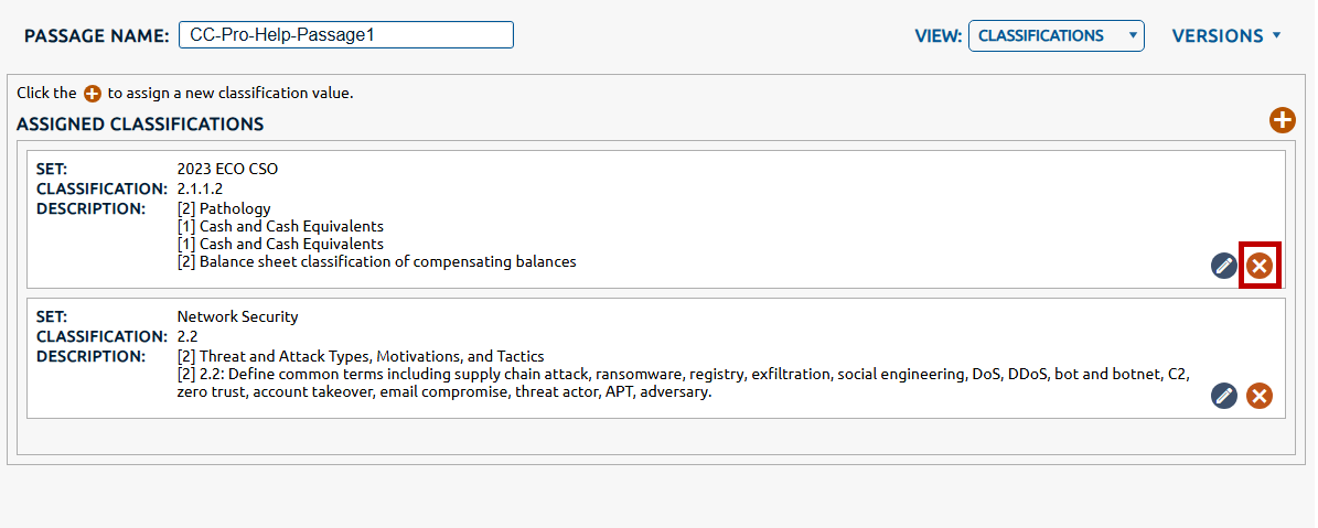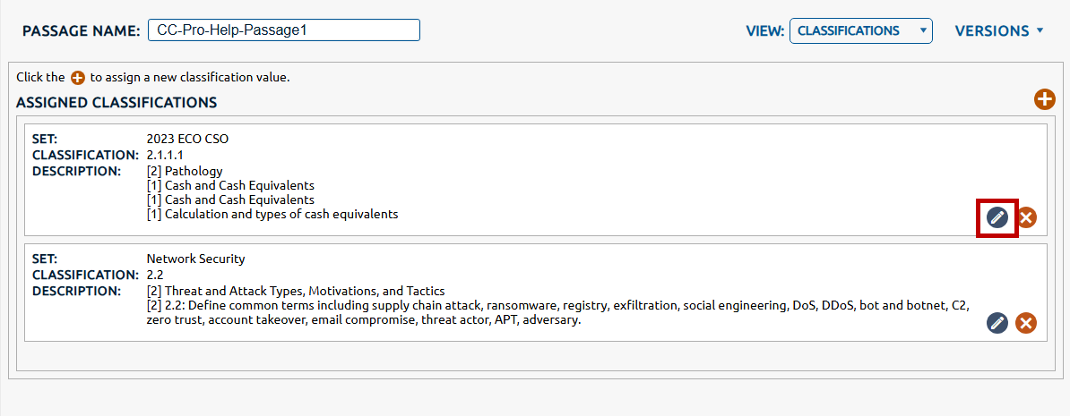 2. The Classifications view is displayed. Any classification values assigned to the passage will be displayed in a list below Assigned Classifications. To edit a value click the pencil icon (highlighted in red, below)