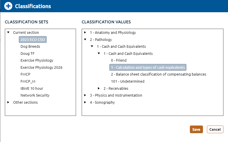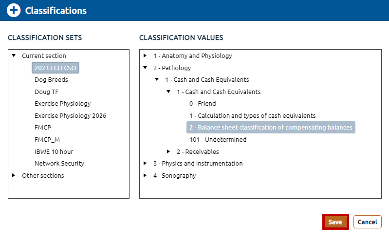 3. The Classifications dialog will be displayed showing the current selection of set and value.