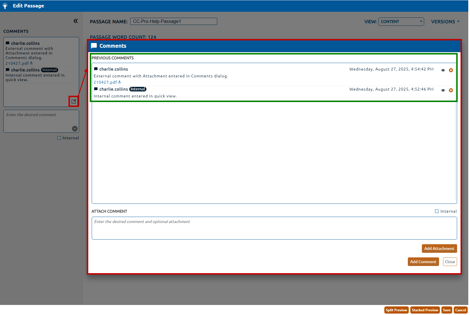 1. In the Comments Quick View, select the dialog icon (highlighted in red, below). This will open the Comments dialog.. All comments for the passage will appear in the Previous Comments field (highlighted in green, below):