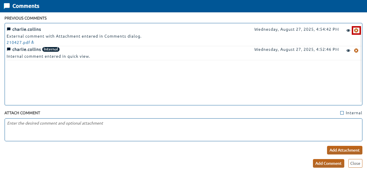 3. To delete an existing comment, click the X button (highlighted in red, below) next to the comment.
