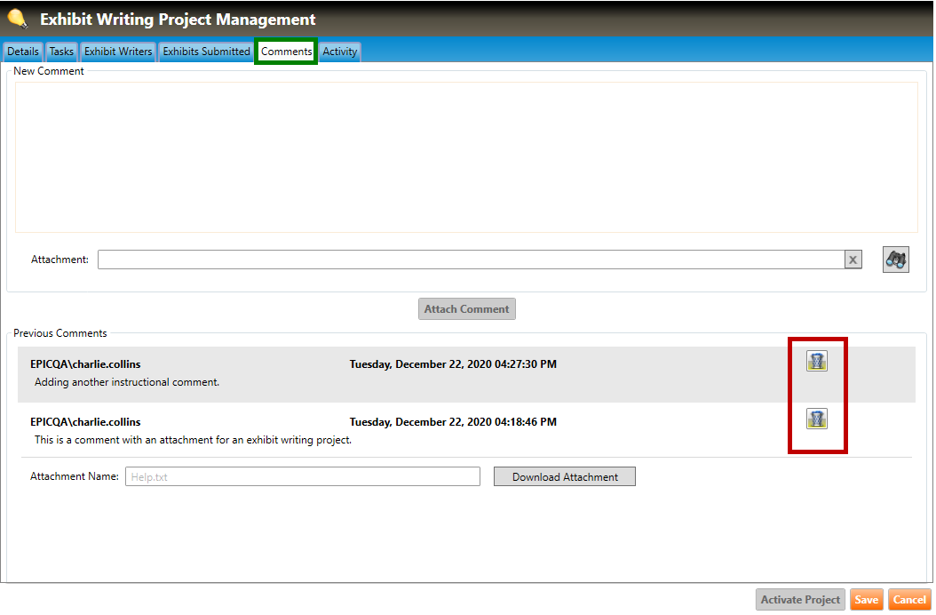 1. Navigate to the Comments tab of the Exhibit Writing Project Management screen (highlighted in green below).