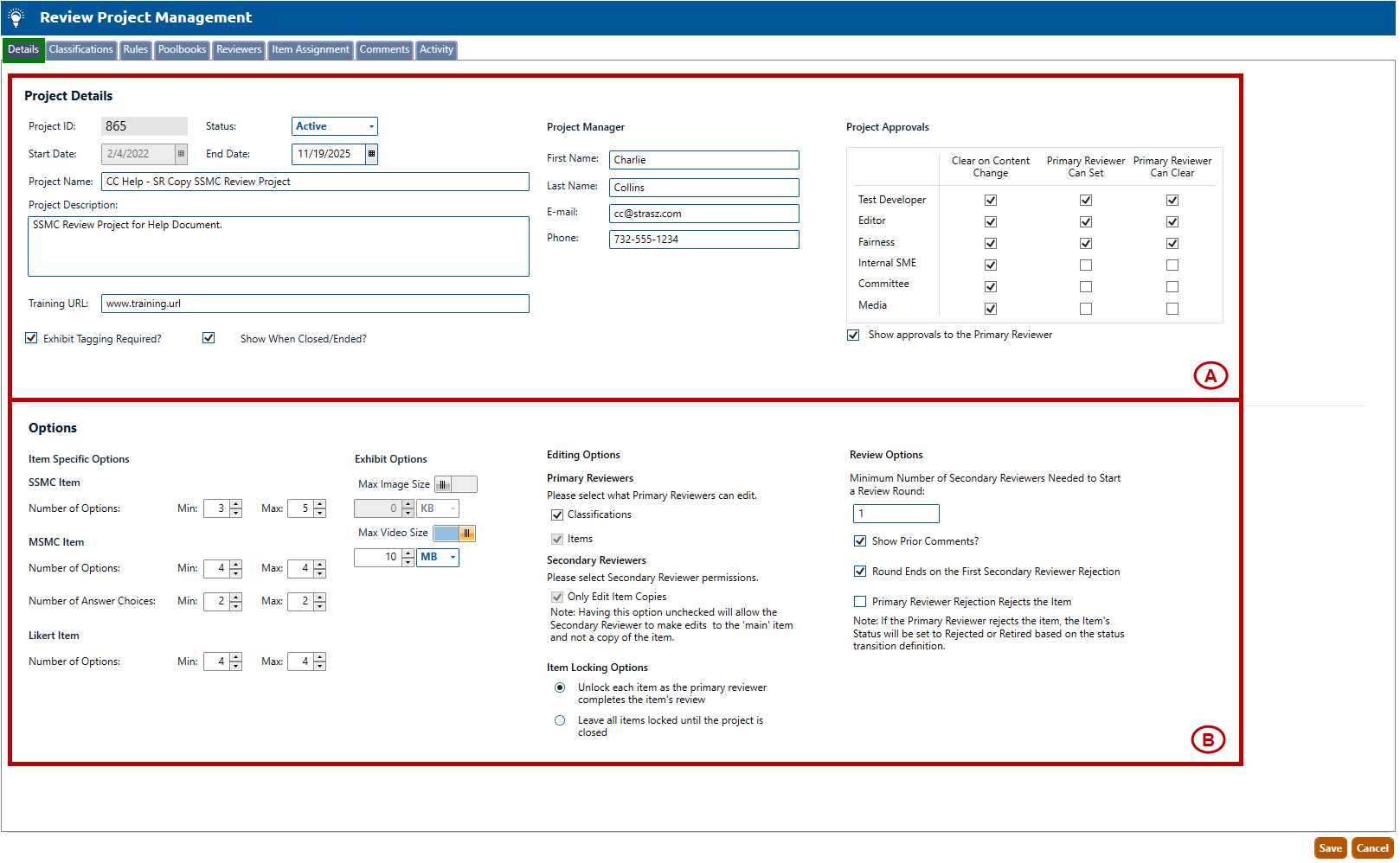 1. Navigate to the Details tab of the Review Project Management screen (highlighted in green, below). Edit any of the fields shown in Steps A and B, below.