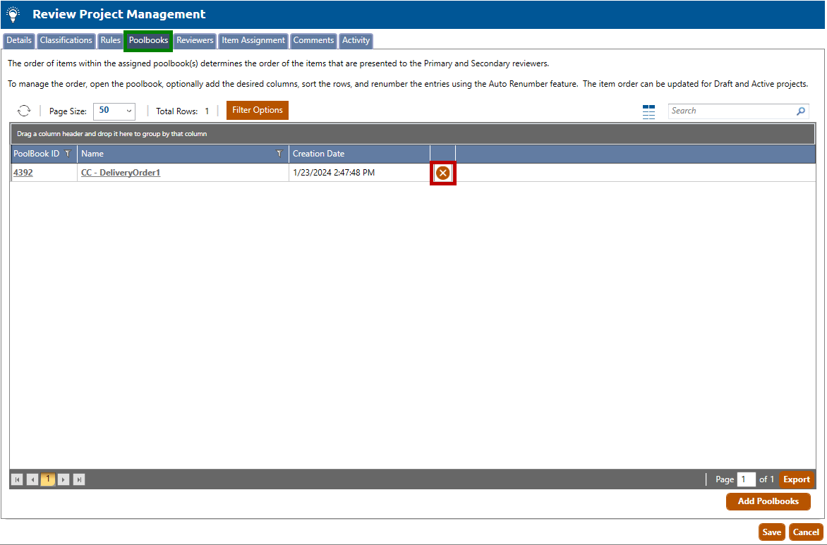 2. To delete a poolbook that has already been added to a project, click the X icon of the desired poolbook (highlighted in red square, above) and follow any confirmation prompts to delete the poolbook.