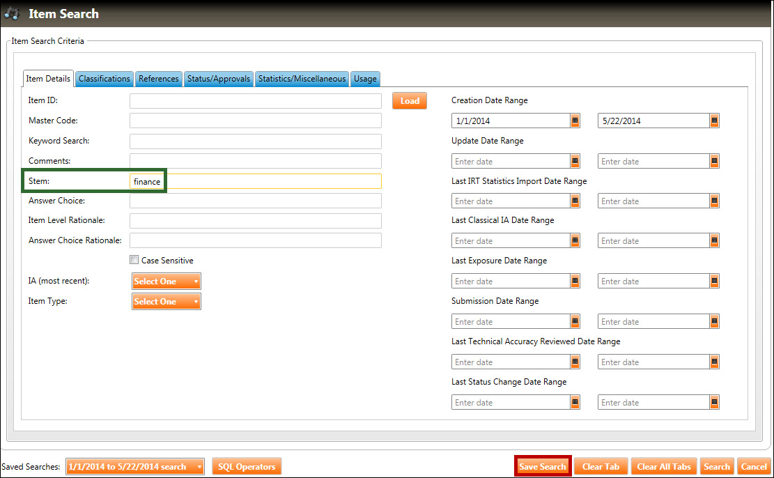 2. Modify any criteria of the saved search. In the example above (highlighted in green), the user wishes to also search for the word "finance" in the stem of the items that they are searching for.
