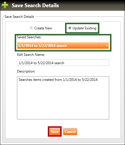4. The Save Search Details window will appear (shown below). Click the Update Existing radio button, select the name of the saved search you wish to update from the Saved Searches dropdown list, then click the Save button.
