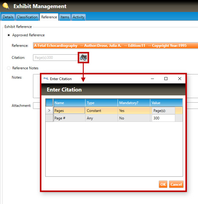D. To add custom citation(s) to the reference, click the binoculars button next to the Citation field in the Exhibit Detail tab, and enter the citation(s) in the Value field(s) of the Enter Citation dialog box (shown below), then click the OK button.