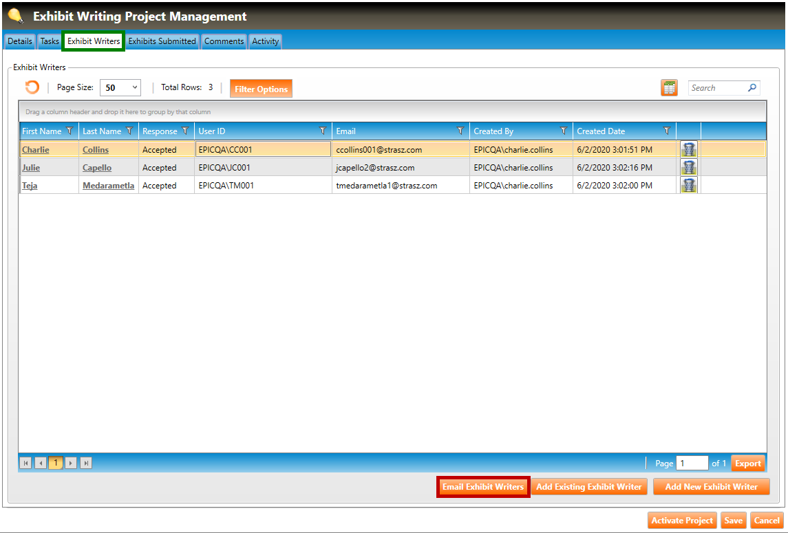 4. Select the recipient(s) for the email from the Email To dropdown list (All Exhibit Writers in Project, Exhibit Writers who accepted, etc.). If you choose Specific Exhibit Writers, then you will be prompted to choose which exhibit writers to send the email to.