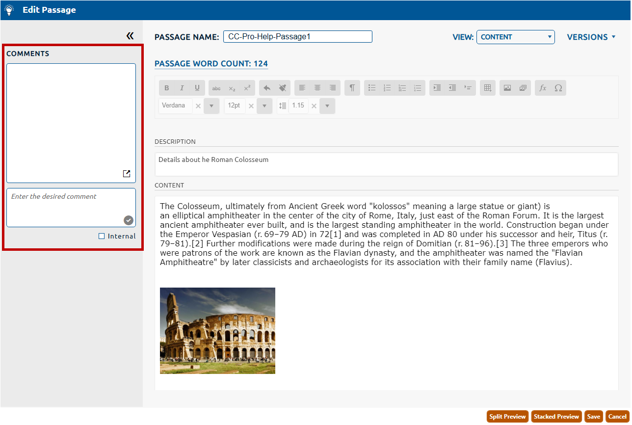 1. The Comments Quick View (highlighted in red, below), allows for text based comments to be quickly added to the passage