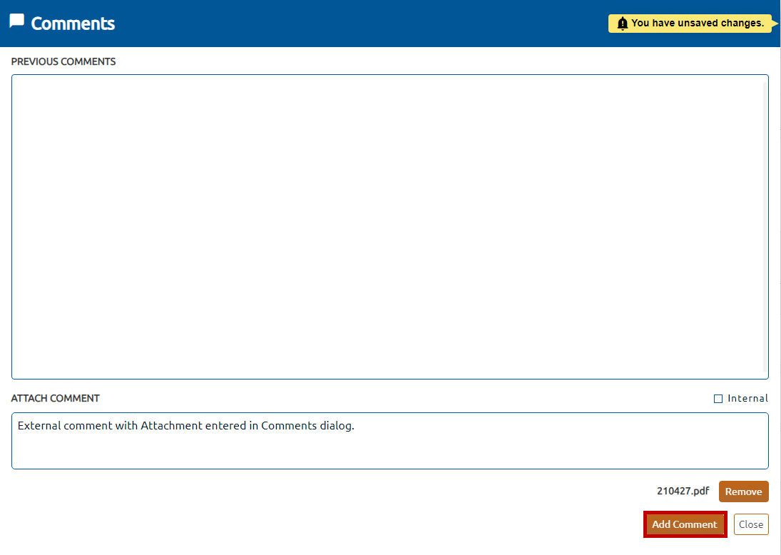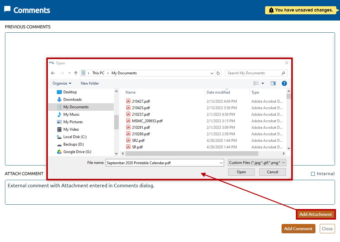 4. Adding an attachment to the comment is optional. If desired, click the Add Attachment button (highlighted in red, below), and use the Open dialogue box to upload a document from a locally mapped drive.