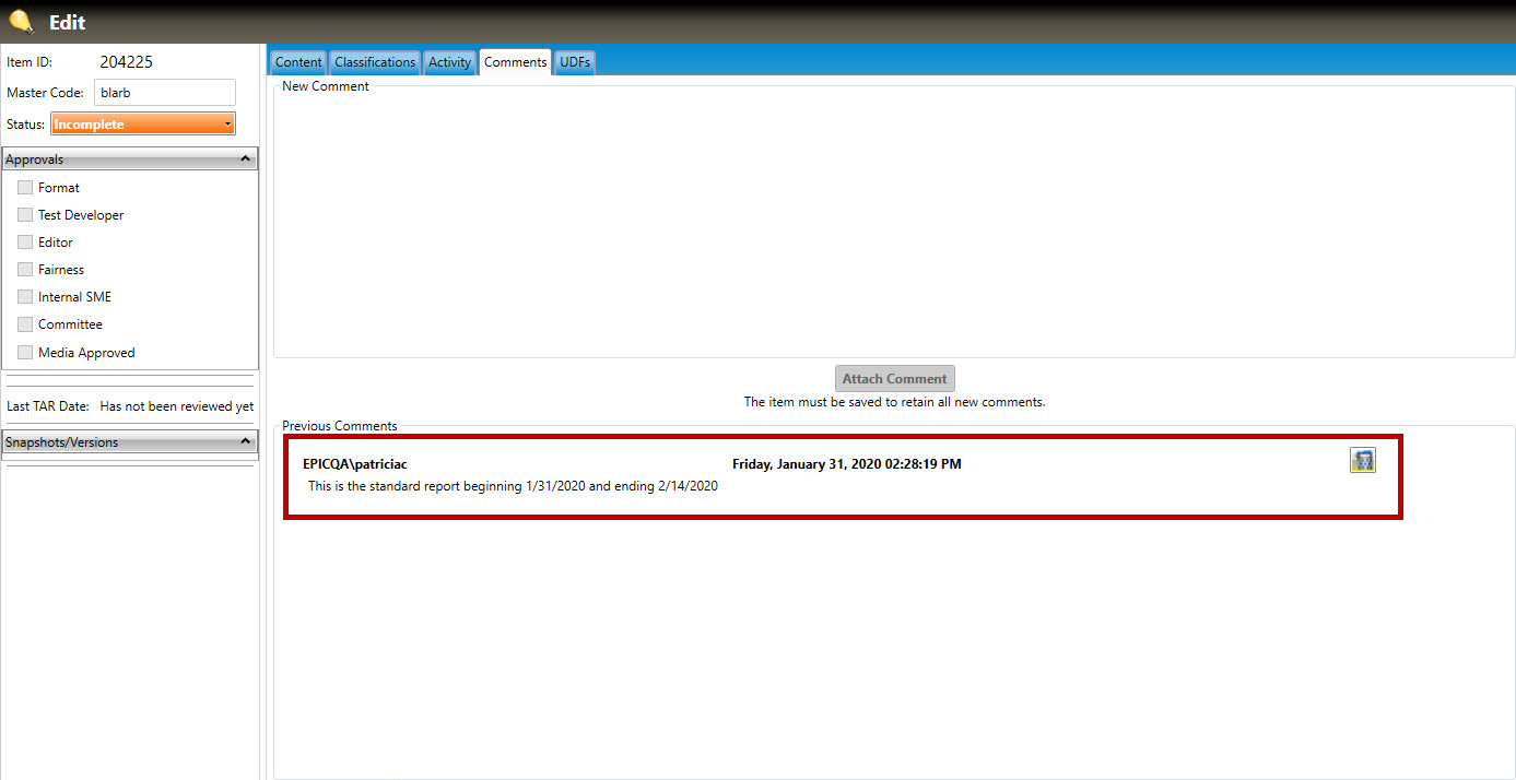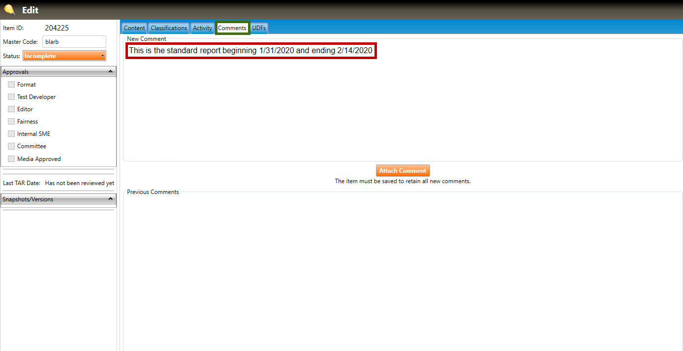 2. Click the Attach Comment button. The comment will appear in the Previous Comments field: