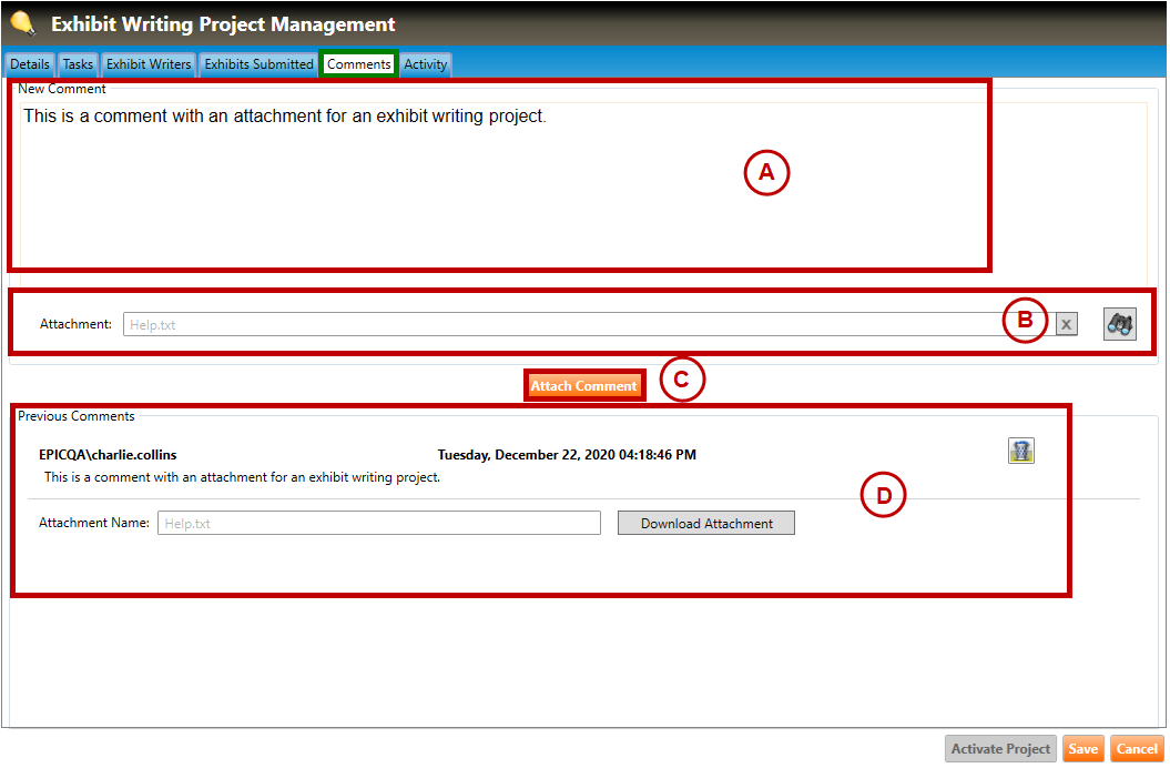 1. Navigate to the Comments tab of the Exhibit Writing Project Management screen (highlighted in green below).