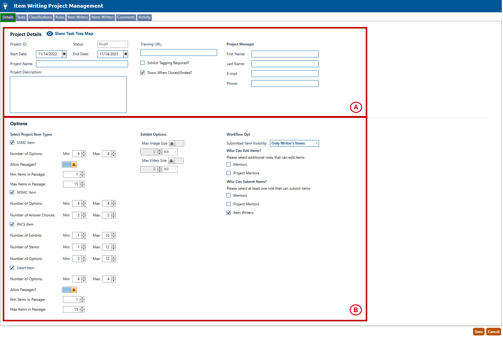1. Navigate to the Details tab of the Item Writing Project Management screen (highlighted in green, below), and follow Steps A and B, below.