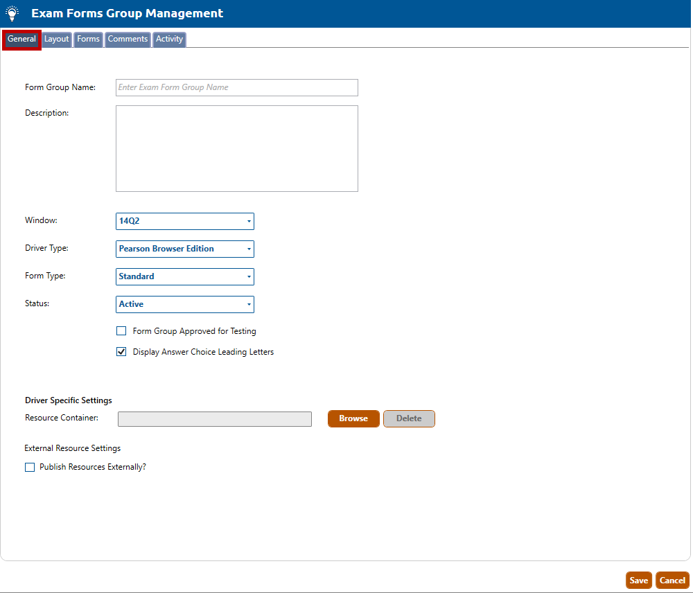 7. Select a Status (Active, Retired, etc.) for the exam form group.