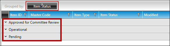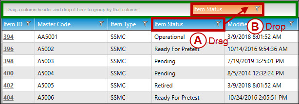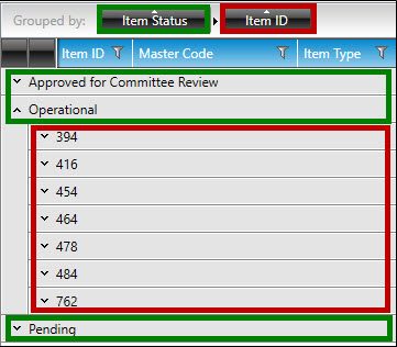 As described in Step 1, above, click and drag a second column heading into the Grouping area of the tabular display to add it to the current tabular display grouping. The tabular display will display multiple levels of groups. In the example below, the user has first grouped the results by Item Status (highlighted in green), then by Item ID (highlighted in red).