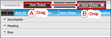 Release the column heading (shown in B, above) on the Grouping area (highlighted in green, above). In the example below, the tabular results are now grouped by Item Status: