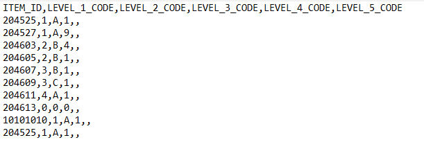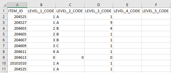 Note: The CSV file must have all of the columns shown below. If your classification has, for example, only three levels of classification, the file must still contain columns for the LEVEL_4_CODE through LEVEL_5_CODE inclusive, in which case the cells in these columns would be blank.