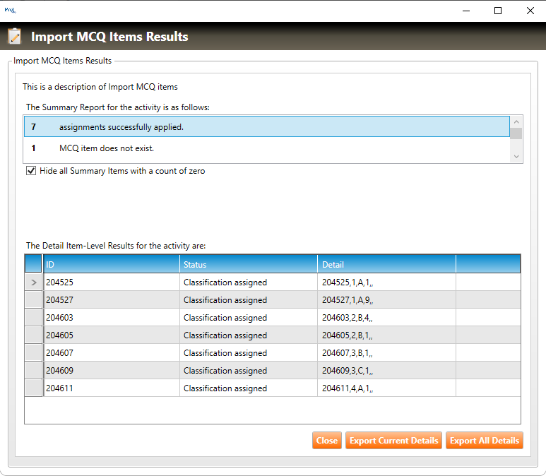 7. The Import MCQ Items Results screen will appear, showing you the results of the import: