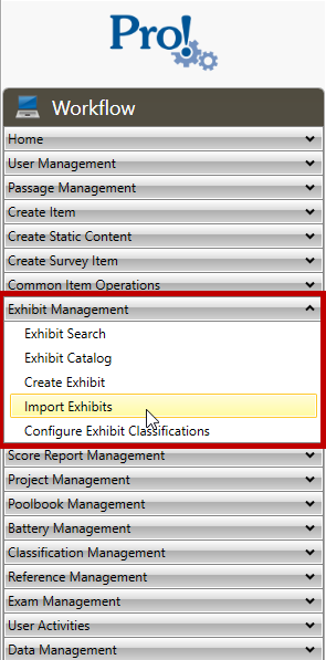 1. In the Workflow menu, click Exhibit Management > Import Exhibits: