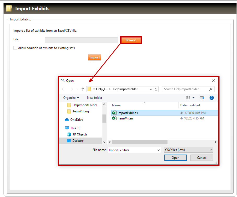 3. Click the Open button to populate the file field with the selected file. Click the Import button to begin the exhibit import process.