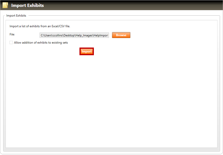 The exhibit import allows you to import one or more exhibits via a properly formatted file (.xlsx or .csv).