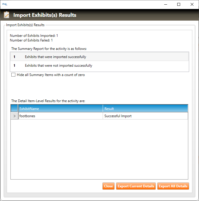 5. The Import Exhibit(s) Results window will appear (shown below). Each exhibit properly detailed on the file will be successfully uploaded to the exhibit catalog.