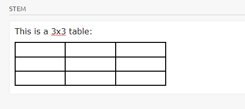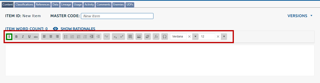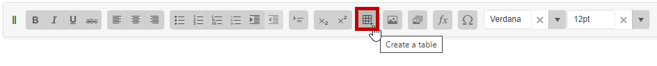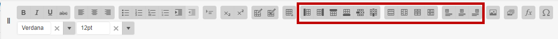 Inserting and editing tables is accomplished using the content areas formatting bar. The formatting bar will become available when clicking in a content area within an HTML item (highlighted in red, below).