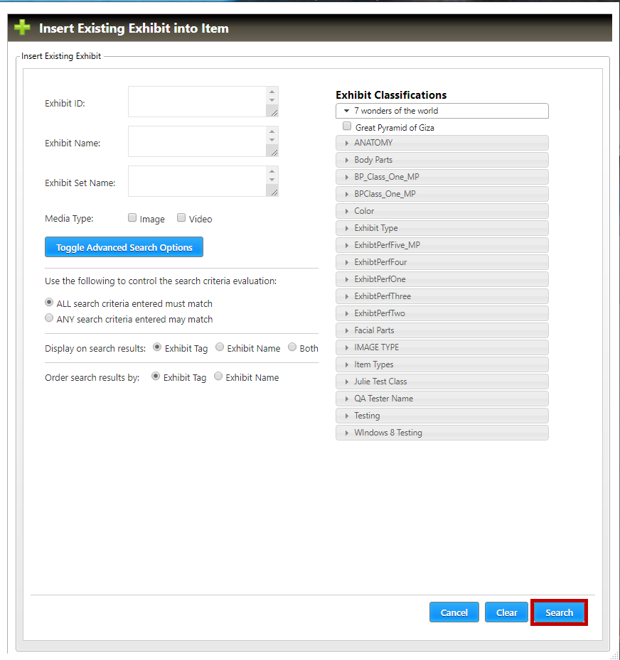 The Insert Existing Exhibit into Item window will appear (shown below). Use the criteria to narrow the search for the desired exhibit, then click the Search button (highlighted in red, below).