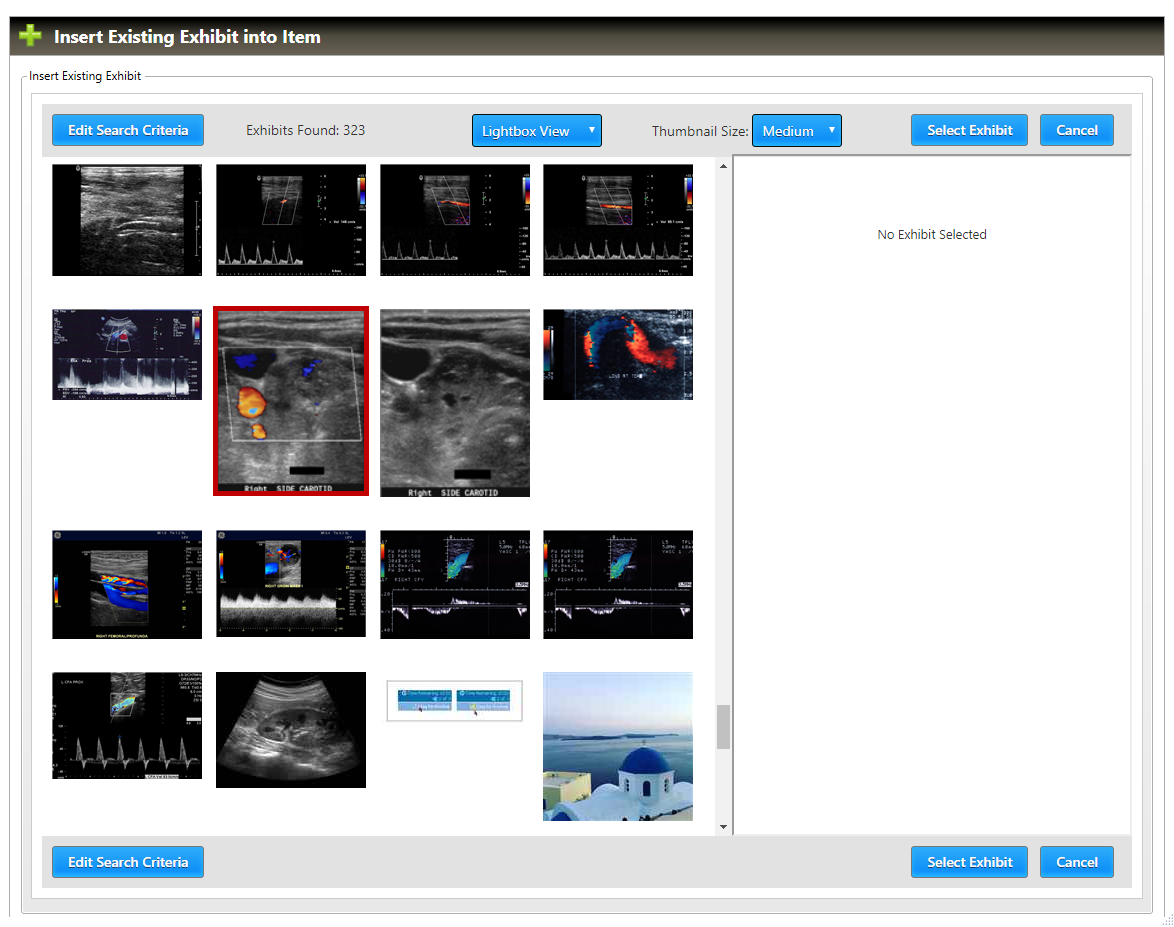The results of the search will be returned as a list of exhibit icons in the left pane of the Insert Existing Exhibit into Item window. Click the icon for the desired exhibit (highlighted in red, below).