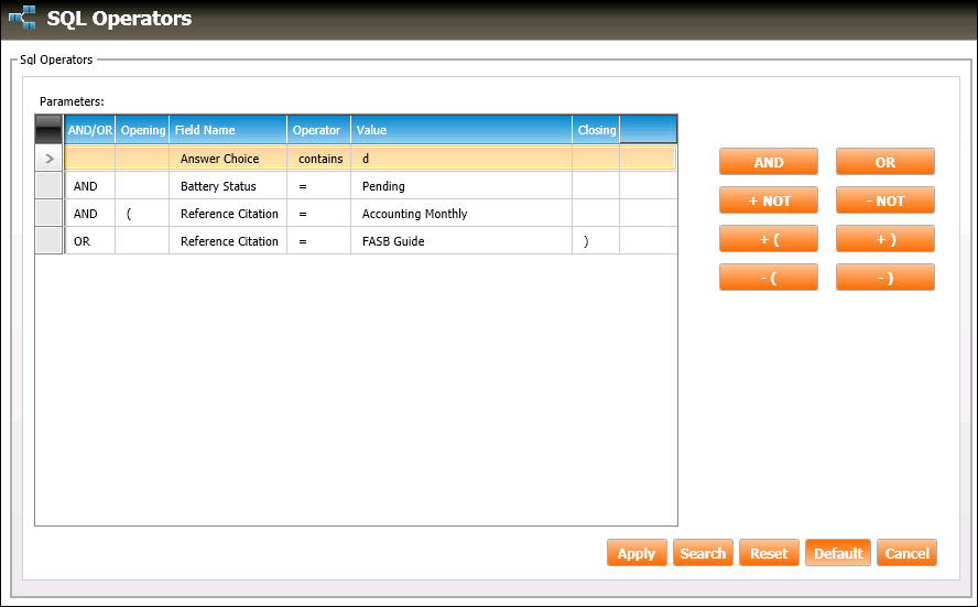 1. After executing an item search by entering search criteria, click the SQL Operators button. The SQL Operators window will appear: