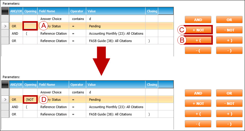 3. Click in the Opening cell of the desired expression, and click the +NOT button, then click the +( button. In the example below, the user has: