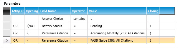 Answer Choice contains "d" OR (NOT Battery Status = "Pending") OR (Reference Citation = "Accounting Monthly") OR (Reference Citation = "FASB Guide)