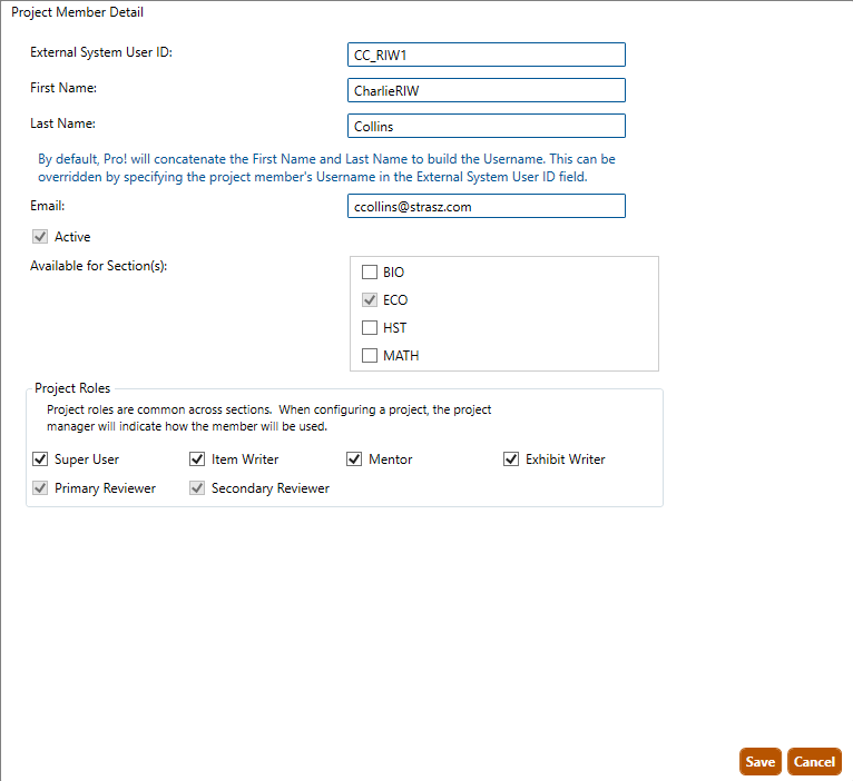 3. Click on a First Name or Last Name hyperlink (highlighted in red, above) to open the Project Member Detail View screen for that project member.
