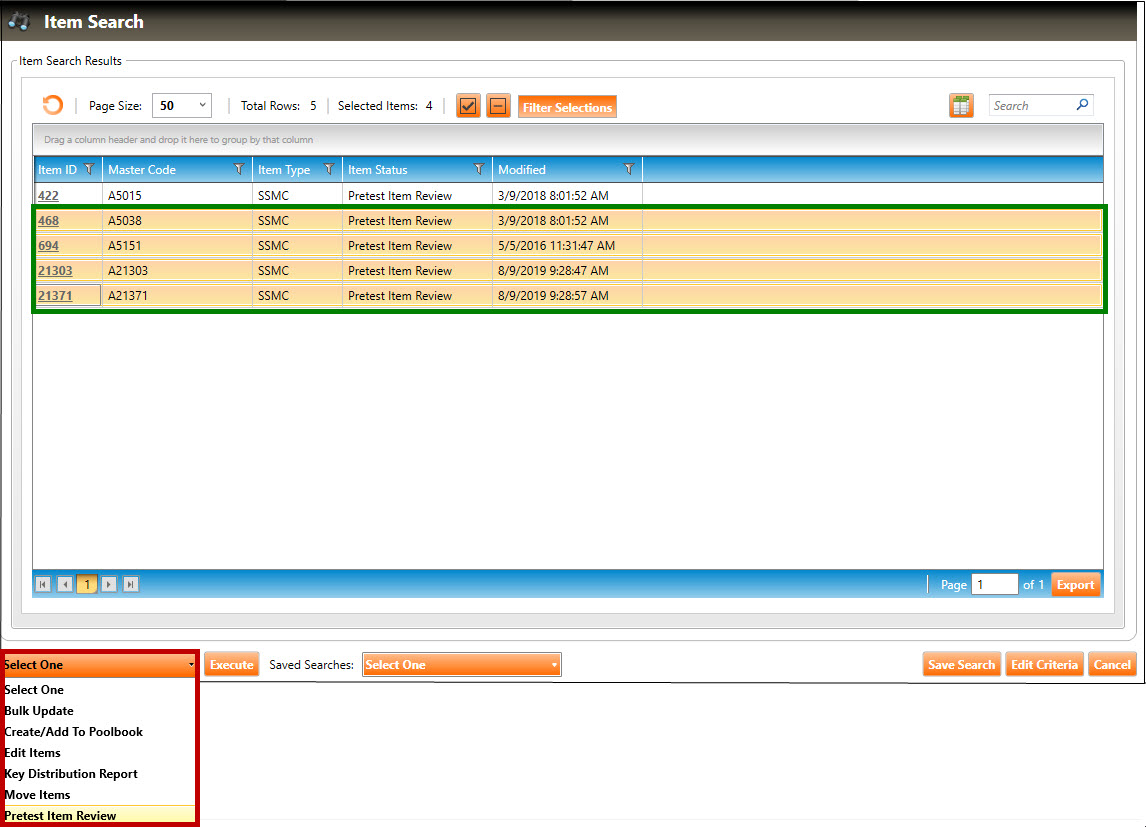 2. Select the items you wish to launch pretest item review for. In the example above, the user has selected four items (highlighted in green).