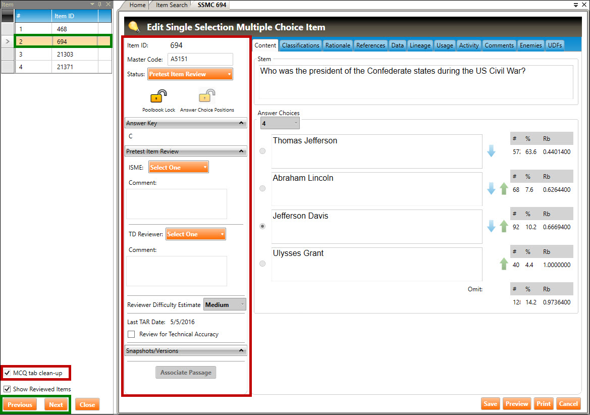 3. Select Pretest Item Review (highlighted in red, above), then click the Execute button. The item environment will appear (shown below), with a menu of items in the left column, and an tab on the right. In the example below, the user has selected Item ID 694 (highlighted in green rectangle), which opened SSMC 694 in a tab (highlighted in red rectangle).