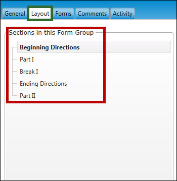 Once you create your sections and populate them with forms, you may choose to re-order the sections. To do this, navigate to the Layout tab (highlighted in green, below). The sections will be listed on the left side of the screen in the order you created them (highlighted in red, below).