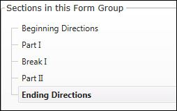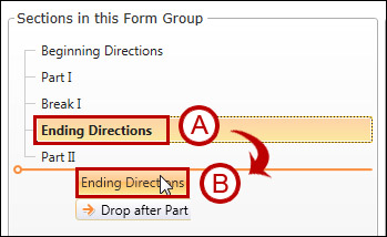 To re-order the sections, simply drag and drop the section names in the desired order. In the example above, the section named Ending Directions should appear after the section named Part II. So, the user is dragging the name Ending Directions (A) below the name Part II (B):