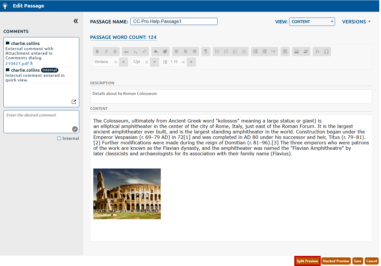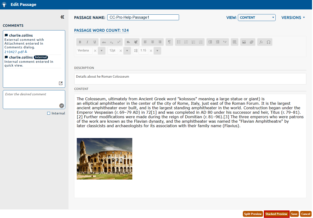 While creating, viewing, or editing a passage, you may wish to preview it onscreen. The preview shows how the passage will appear to an exam taker. There are two preview options for a passage, split and stacked.