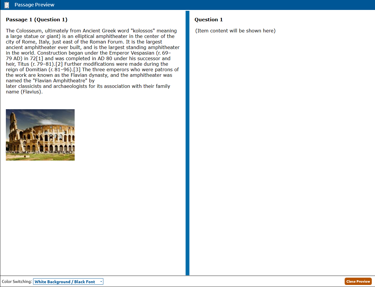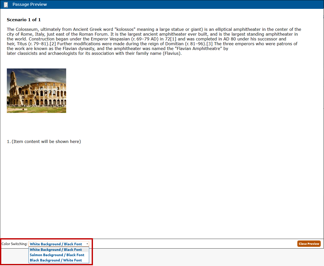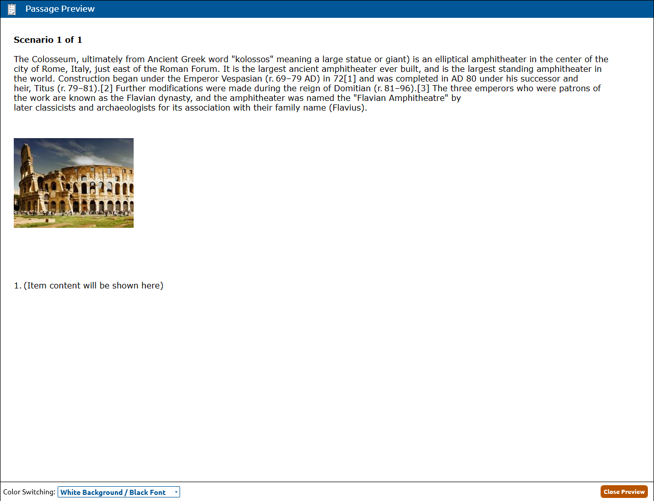 2. The Passage Preview dialog will open with the passage displayed above the associated item content. Click Close Preview to shut passage preview window.