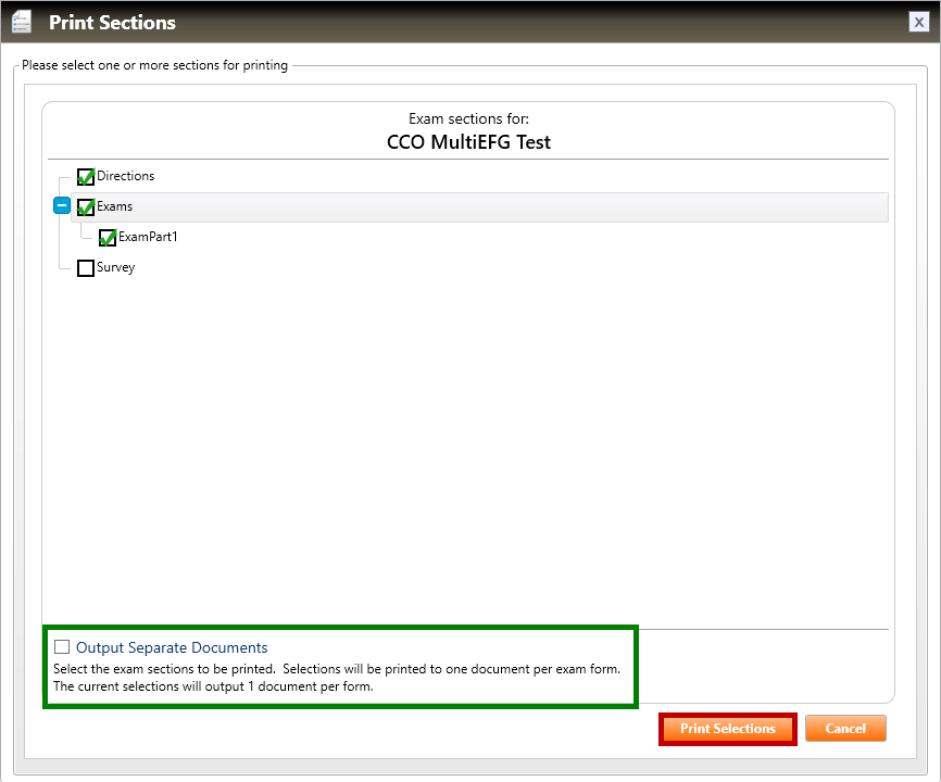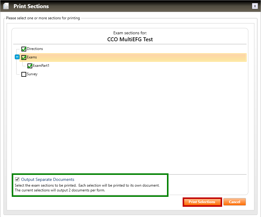 3) Selecting the sections to be printed, will enable the Print Selections button (highlighted in red, below). By default the Output Separate Documents checkbox is selected (highlighted in green, below). Leaving it selected will place each selected section within its own Word document for each form within the form group. In the example below, the CCO MulitEFG Test form group contains two forms and two sections are selected. This will result in four documents being produced.