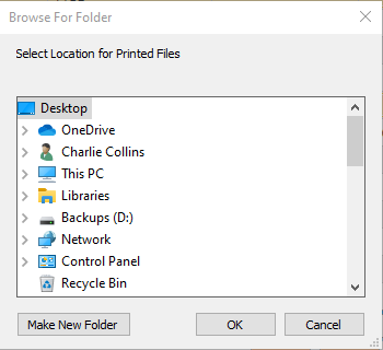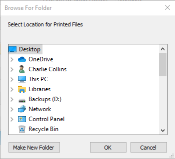 2) The Browse For Folder dialog is displayed. Select a location to write the print output, then click the OK button.