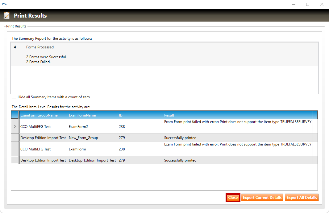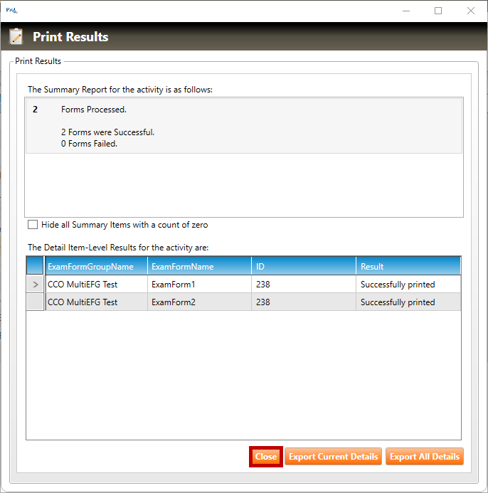 4) The Print Results dialog is displayed. The dialog will show which forms were printed successfully, as well as any that may have errored. Click Close (highlighted in red, below) to dismiss the dialog.