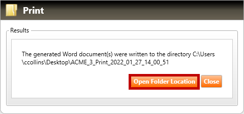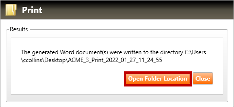 8) The Print dialog will display the location of the successfully printed Word document(s). Click Open Folder Location (highlighted in red, below) to open the folder containing the print output.