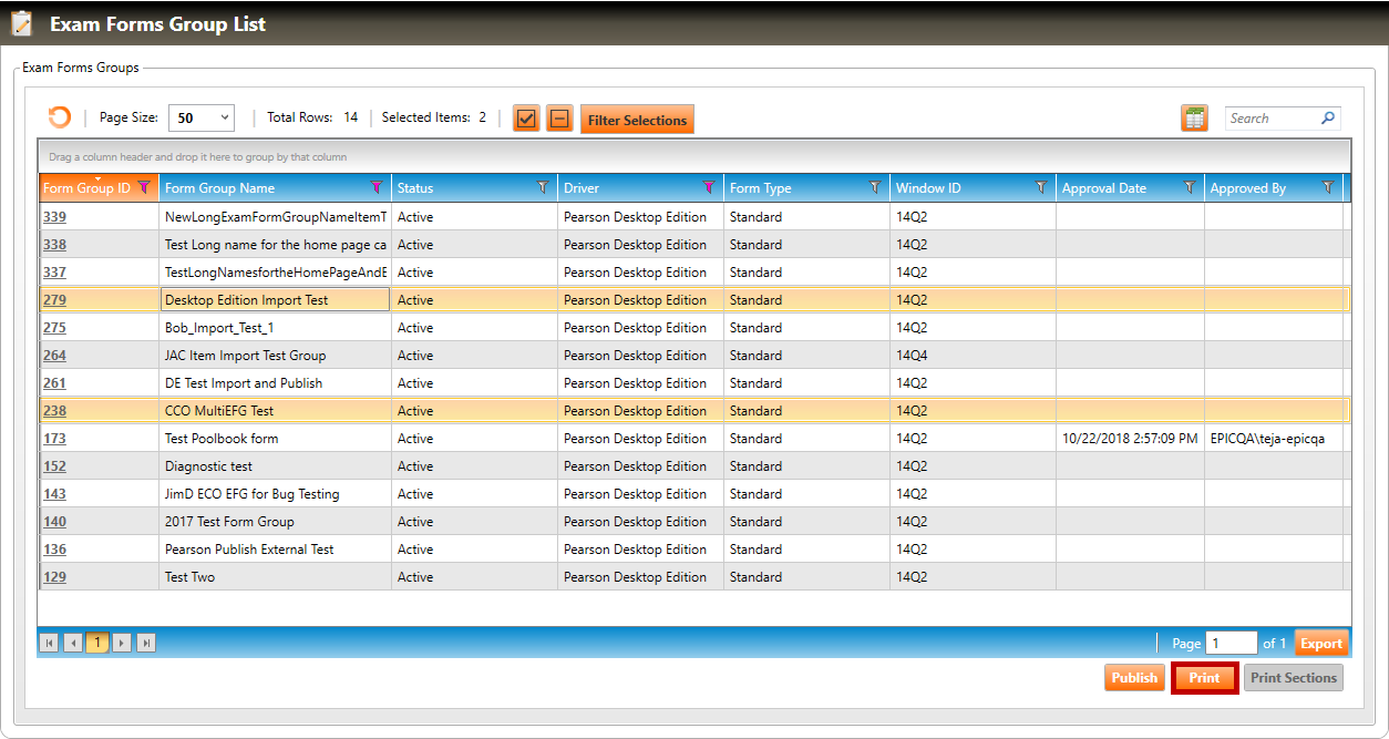 1) Select one or more exam form groups from the Exam Form Group List page and click the Print button (highlighted in red, below).