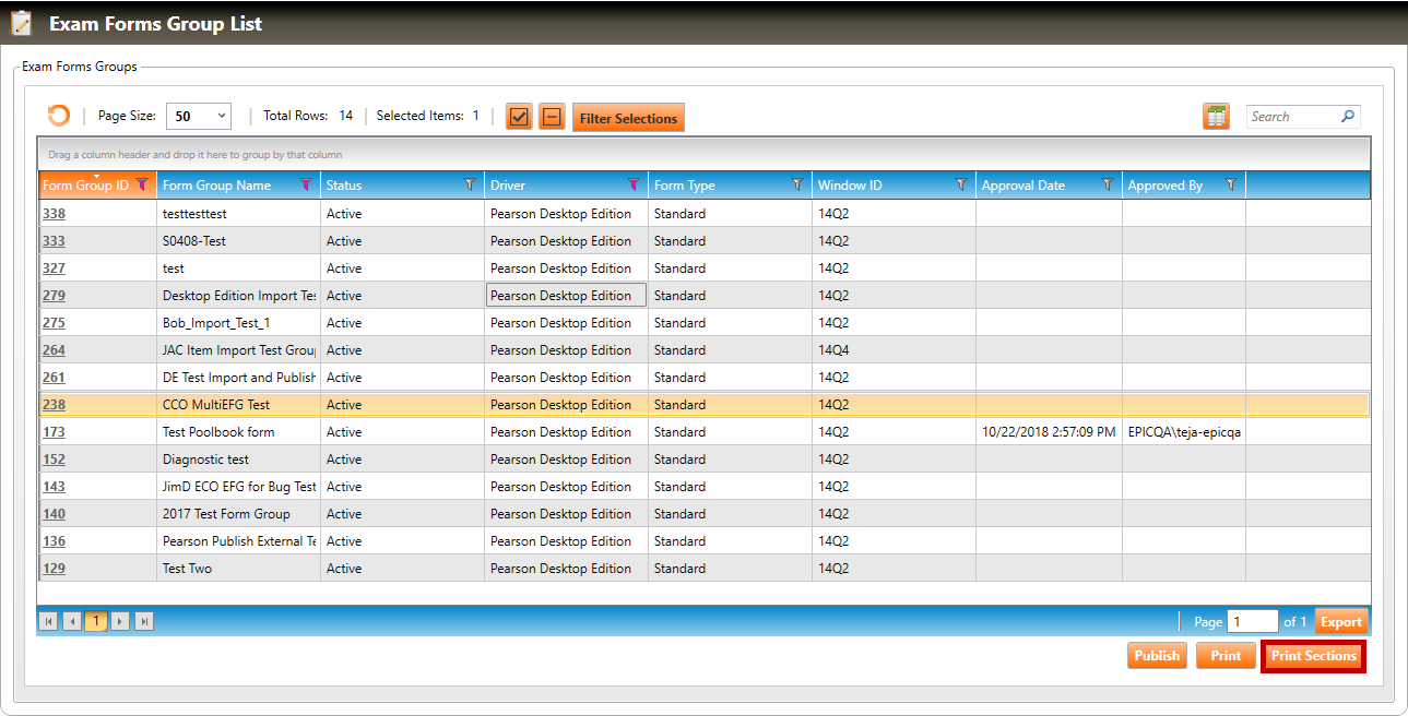 1) Navigate to the Exam Form Group List page and click the row of the exam form group to be printed. Click the Print Sections button (highlighted in red, below) that was enabled with the exam form group selection.