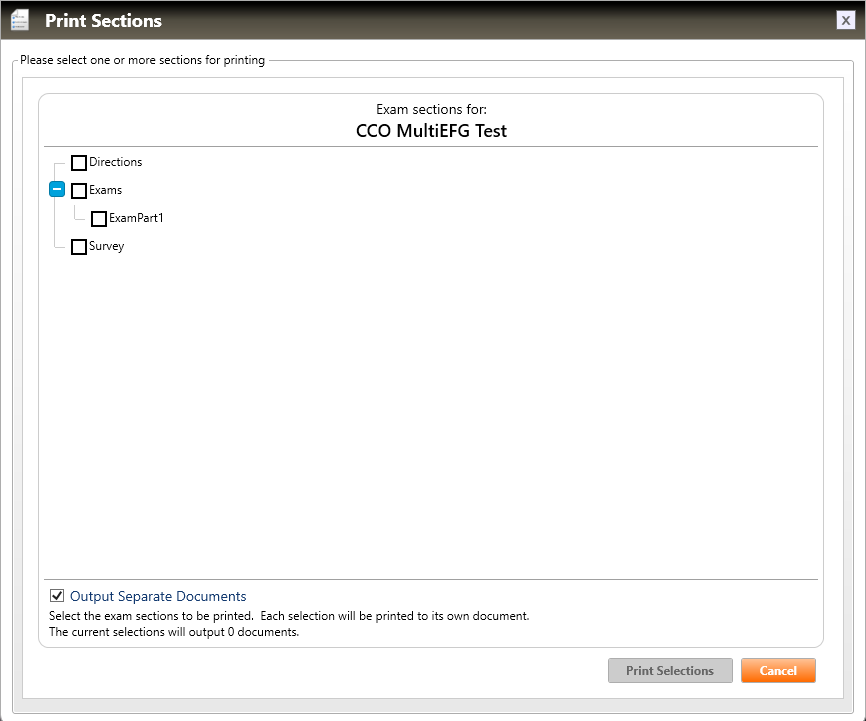 2) The Print Sections dialog box will display each of the layout sections of the selected exam form group.