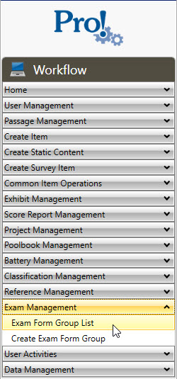 In the Workflow menu, click Exam Management> Exam Form Group List: