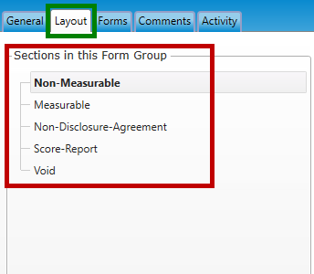 To re-order the sections in the form, navigate to the Layout tab (highlighted in green, below). The sections will be listed on the left side of the screen (highlighted in red, below).